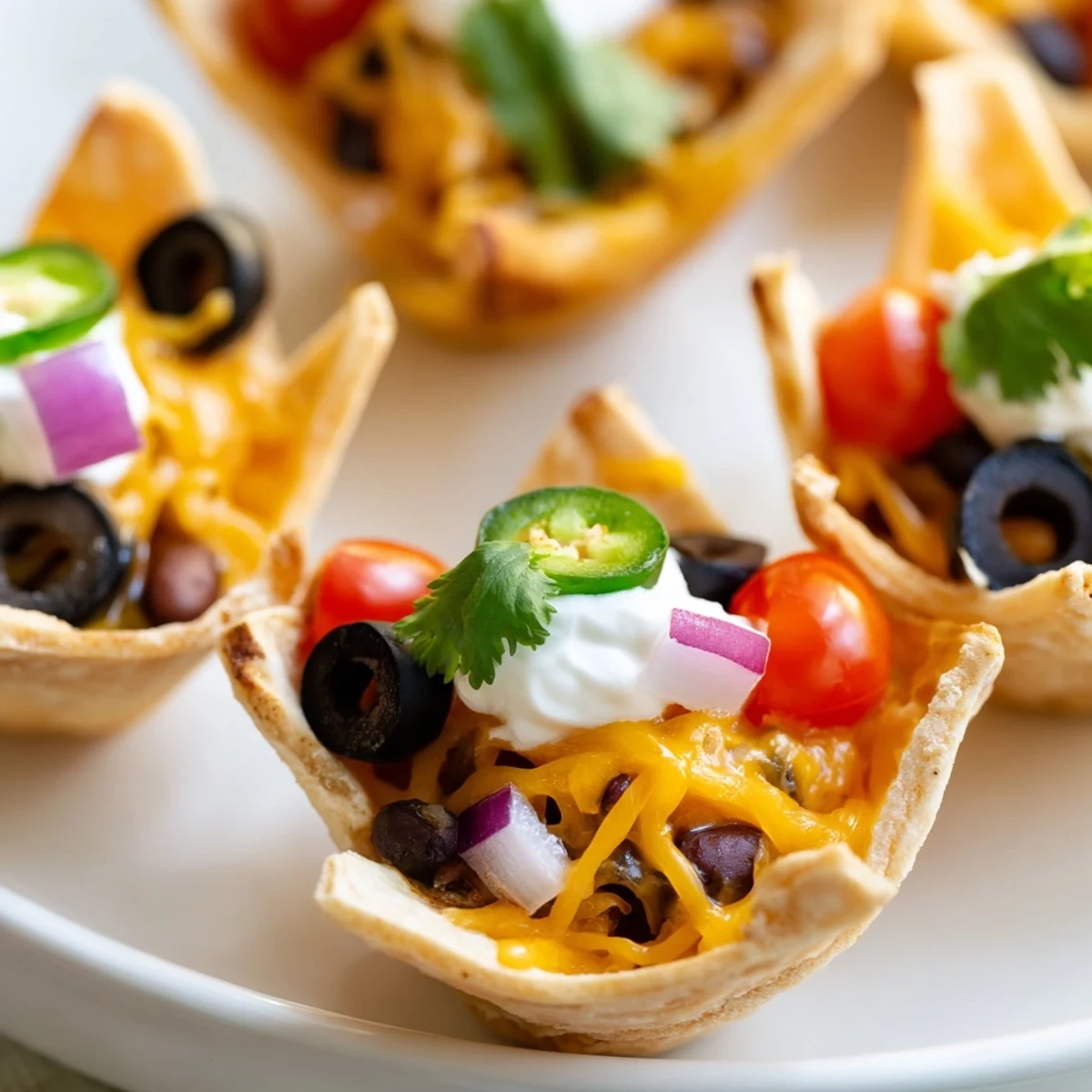 These bite-sized nacho cups transform ordinary tortilla chips into edible vessels for all your favorite toppings. Start by pressing scoop-style chips into a mini muffin tin, then load each with a blend of sharp cheddar and creamy Monterey Jack. Pile on black beans, diced cherry tomatoes, sliced olives, jalapeños, and red onion before baking until everything gets melty and golden. The result? Twelve individual servings that are perfect for passing around during parties or settling in for the big game. Top with sour cream and fresh cilantro just before serving, and pair with salsa or guacamole for dipping.