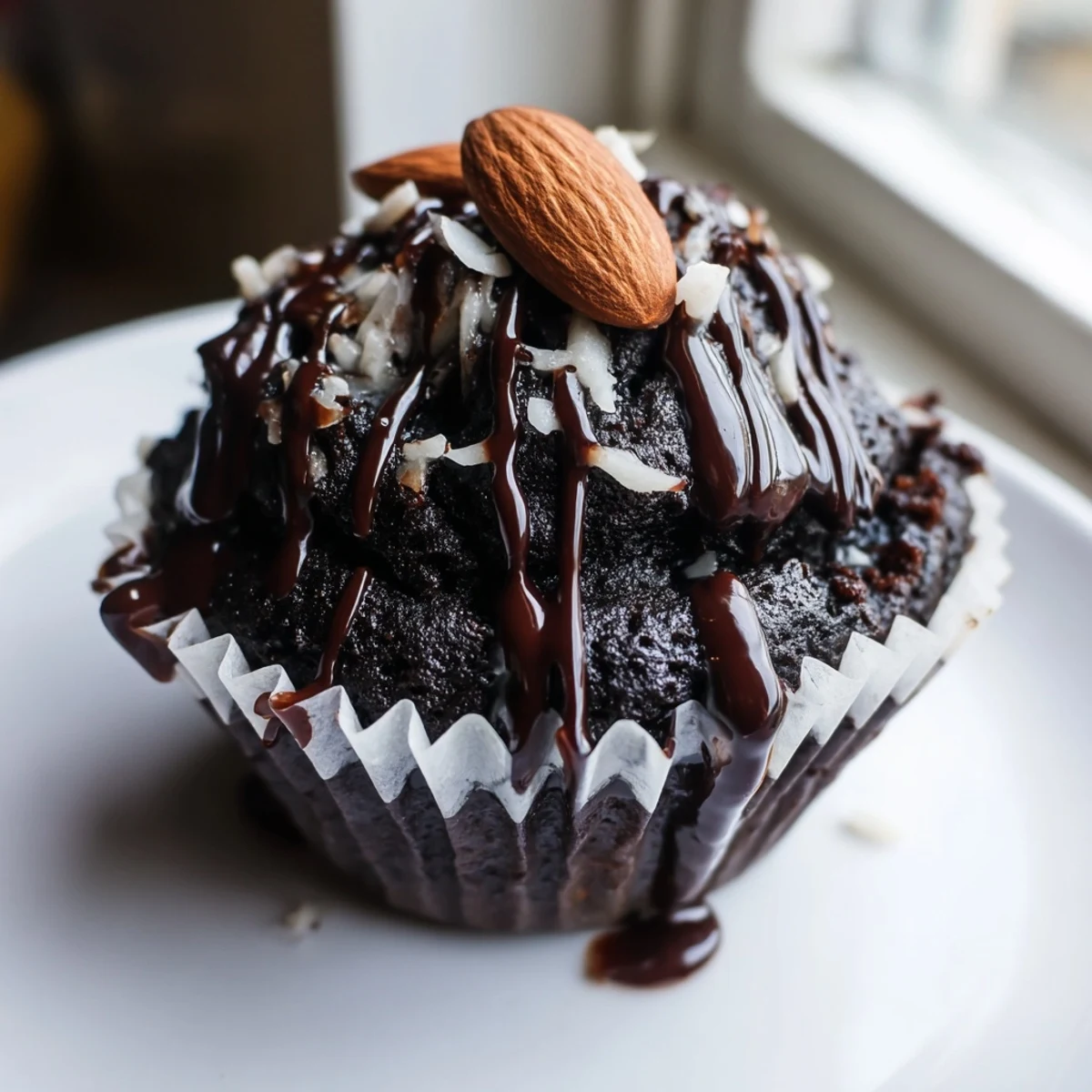 These flourless chocolate cupcakes capture the essence of the beloved Almond Joy candy bar. Each rich, gluten-free cupcake features a velvety chocolate base made with melted chocolate chips, butter, eggs, and cocoa powder. The center gets a surprise filling of sweetened coconut mixed with condensed milk and vanilla, while toasted roasted almonds crown the top. A final drizzle of melted chocolate adds the perfect finishing touch.