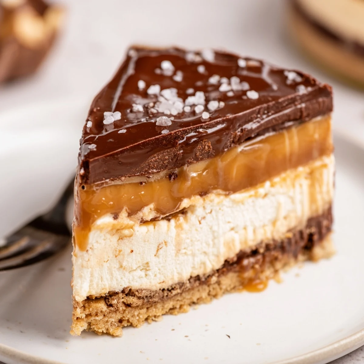 This ultra-indulgent, layered cheesecake starts with a crunchy digestive biscuit base pressed into a 23 cm springform tin, followed by a silky, salted caramel cooked until thick. A smooth cream cheese filling is folded with whipped double cream and vanilla, chilled until firm. Finish with a glossy dark chocolate ganache and chill again; slice with a warm knife for clean layers and serve chilled.