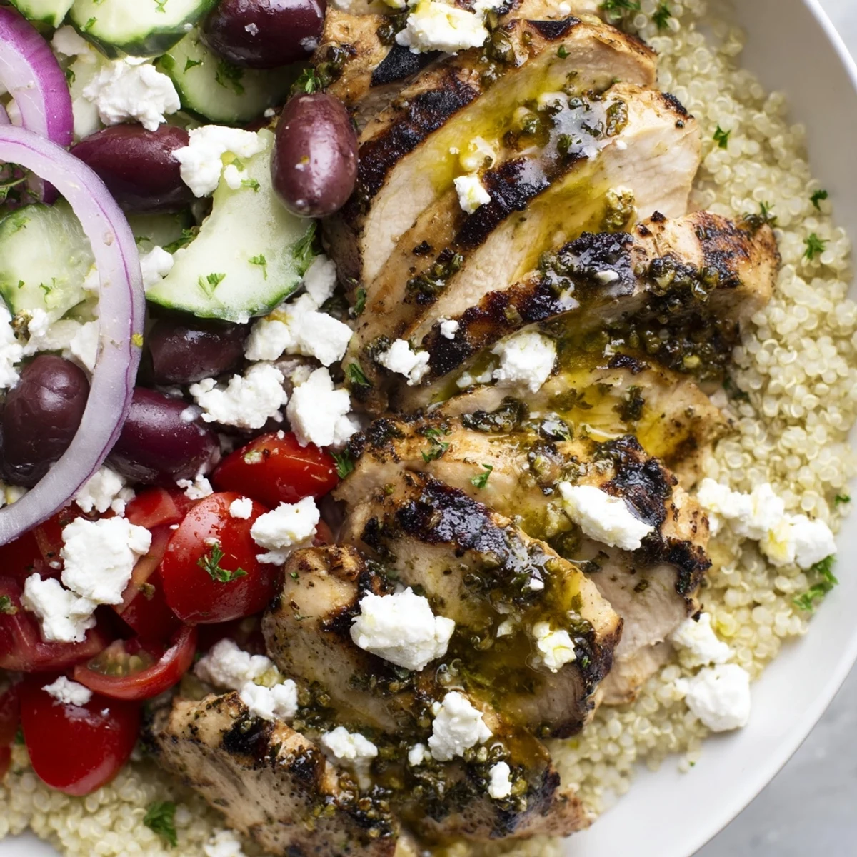 This colorful bowl combines tender marinated chicken breast with fluffy quinoa, cherry tomatoes, crisp cucumber, red onion, Kalamata olives, and tangy feta. A bright lemon-herb dressing ties everything together.