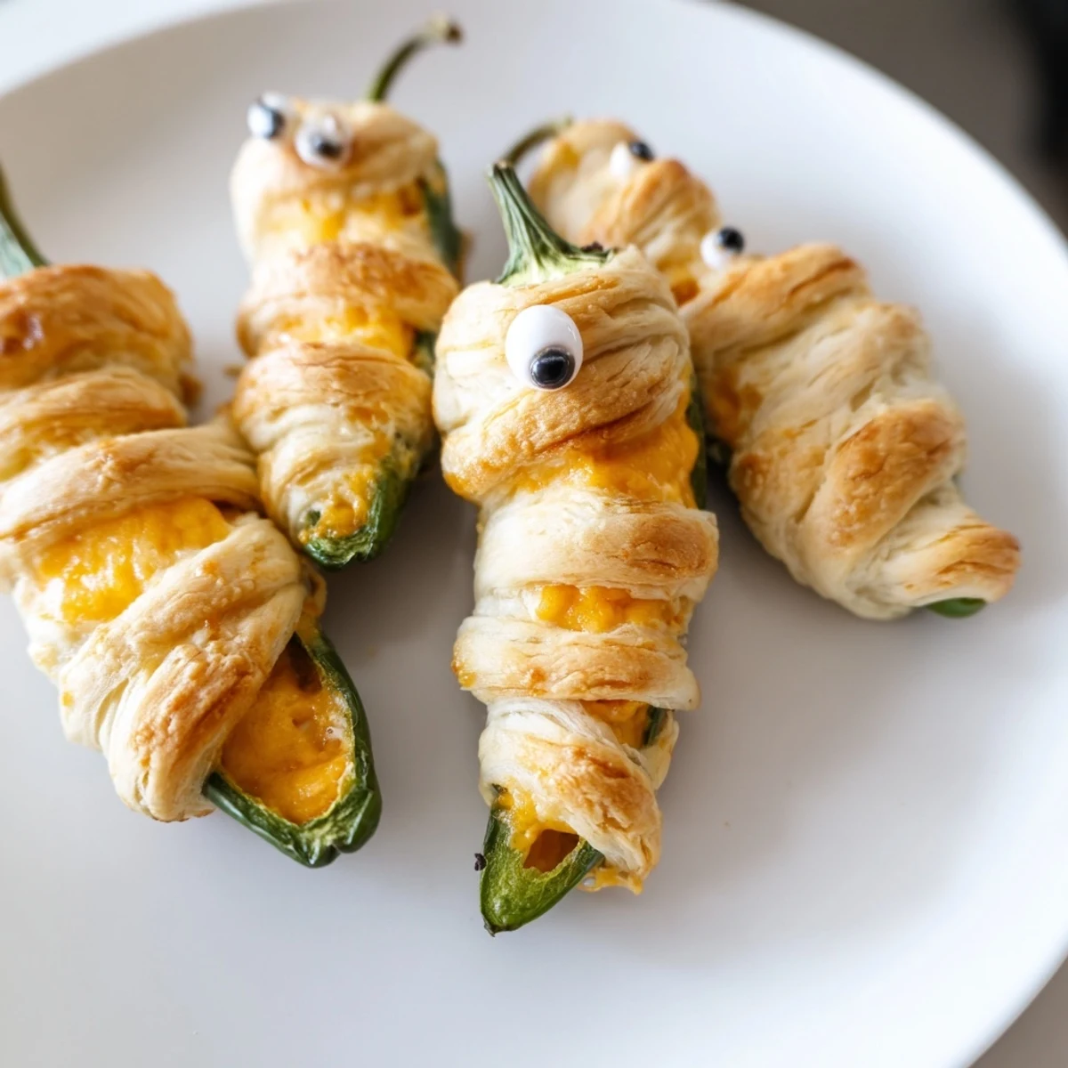Create these festive Halloween appetizers by halving fresh jalapeños and filling them with a savory blend of softened cream cheese, sharp cheddar, minced garlic, smoked paprika, and aromatic onion powder. Wrap each stuffed pepper with thin strips of refrigerated crescent dough, leaving space near the top for playful eyes. Brush with egg wash for golden color and bake until the pastry turns perfectly crisp and brown. Complete the spooky look by attaching candy eyes or olive slices to the exposed pepper tops. These creamy, slightly spicy bites deliver satisfying crunch and rich flavor—perfect for parties or family gatherings.